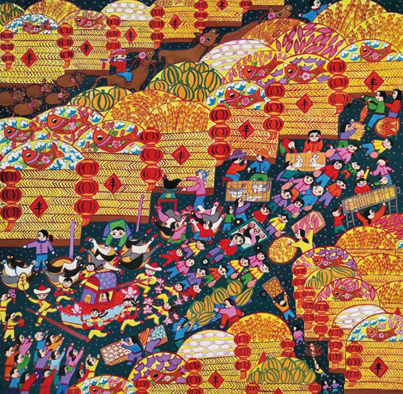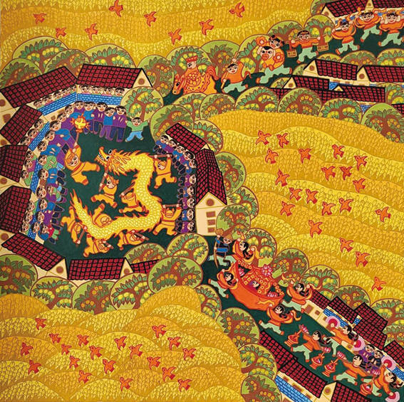 而丁广华的《民俗展演庆丰年》则聚焦传统民俗与现代生活的交融:舞龙队伍穿梭于金灿灿的稻田之间,看戏的村民笑逐颜开,红色与黄色的主调将丰收的喜庆渲染得淋漓尽致。“现在政策好了,经常有送戏下乡,老百姓坐在家门口就能看戏。”丁广华说,“我的创作灵感就来源于此,传统舞龙是人们对美好生活的祝福,遍地都是金灿灿的稻子也是现在富足生活的象征。”