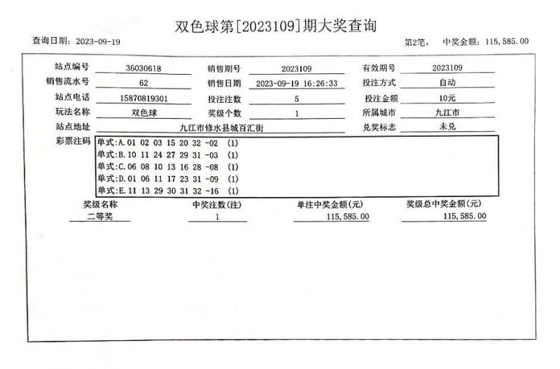 九江1注二等奖出自九江市修水县36030618号投注站,中奖彩票为一张10元单式票,喜中1注二等奖,奖金共计115585元。