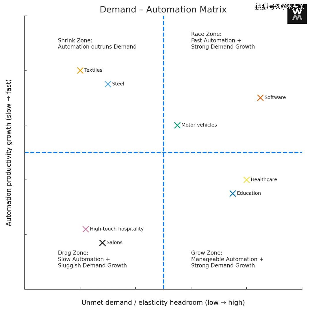 汽车行业是一个例外。至今,全球汽车需求量仍未达到饱和,自动化也没有完全取代制造业(例如特斯拉未能完全实现“无人工厂”)。这表示,当一个产业同时具备高需求增长与高自动化潜力时,就业水平能够长期保持稳定甚至上升。